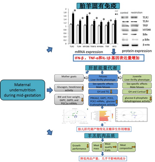 长久以来,妊娠期营养不足问题不仅是人类优生学、流行病学等普遍关注的问题,也是畜牧业生产长期致力和关注的重要问题。肝脏是能量代谢和蛋白质代谢的中枢器官,调谐机体整体的能量和蛋白质输入和输出流,是机体能量和蛋白质代谢异常的感知器官和效应器。骨骼肌在营养分配方面的优先性低,使得它极易受营养缺乏所影响。此外,肝脏也具有重要的免疫功能,血液通过门静脉从消化道进入肝脏,使肝脏不断暴露在致病微生物的环境中。肝脏通过一系列模式识别受体,主要是toll样受体(TLRs),形成独特的免疫反应。小反刍动物(绵羊和山羊)在体型、妊娠时间、怀胎数量、器官发育进程方面与人类存在高度相似性,是研究妊娠期营养的理想模式动物。