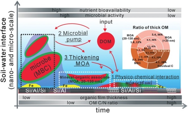 基于微界面连续观察结果,我们提出了土壤有机质稳定性的固-液耦合生物地球化学机制:微生物介导的有机质转化过程,为有机-无机复合物多层自组装结构形成提供了丰富的物质基础;增厚的有机质层反过来不仅存储了可利用态养分,还屏蔽了内层有机质的降解,进而限制了溶液中微生物代谢,共同促进了有机质的稳定性。该机制很好地耦合了物理化学和生物学控制机制,为土壤有机质连续体模型(Soil continuum model, 2015, nature)提供了直接可观察的证据;同时,为Z轴上增加土壤碳固定提出了结构性启示。该成果是土壤芯片技术(SoilChip)提出以来的第三篇原创性论文,土壤芯片技术为理清土壤多过程耦合的复杂生物地球化学循环提供了微观可控的研究方法,未来结合同位素示踪技术和先进的界面表征技术,可为认知土壤其他元素或者污染物的归趋提供基于微-纳尺度过程的基础性知识。