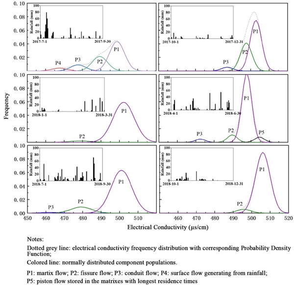 以NO3-为示踪剂,将溪流水补给来源概化为土壤和表层岩溶带两种储水介质,应用二元混合模型,发现表层岩溶带是溪流水的最重要补给来源。次降雨事件中,土壤水对溪流水的贡献量最大仅有16.8%;而在年尺度,土壤水平均供水量为1.4%。将表层岩溶带进一步细分为管道、裂隙、基质,根据水流在三种导水介质中的滞留时间不同而引起的电导率值的差异,应用电导率频率分布(CFD)方法,发现由于小流域岩溶化发育程度较低,基质流均是溪流水最主要的补给来源(旱季>80%、雨季>55%),但管道在小流域富水阶段也是重要的排水通道(最大10%-15%)。