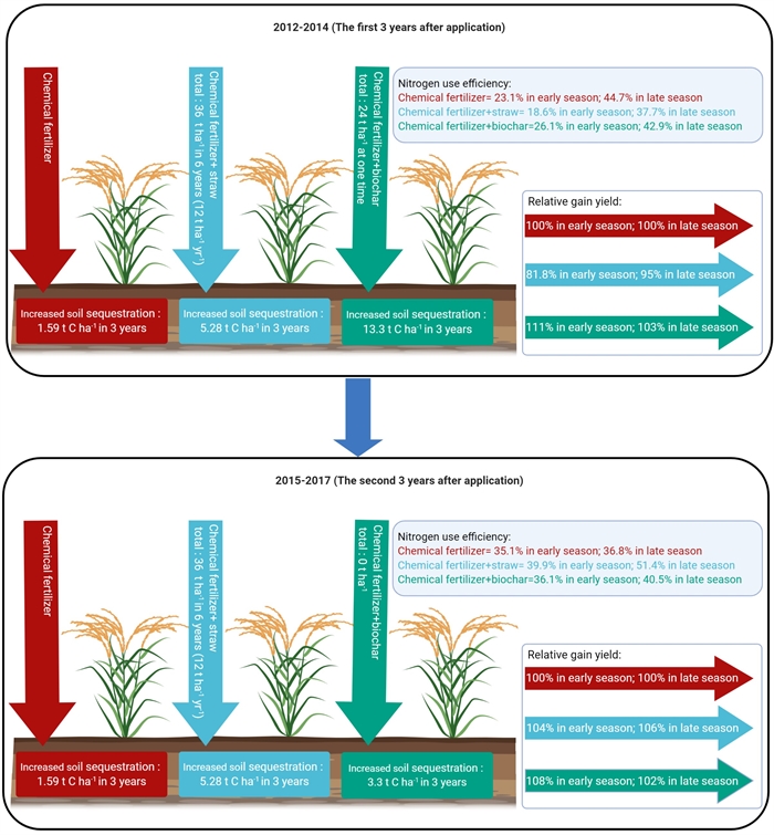 全量秸秆还田及低量生物质炭施用下6年中土壤碳固持、水稻产量及氮肥利用率变化