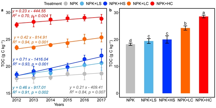 秸秆还田及秸秆源生物质炭施用下6年中土壤总有机碳含量变化