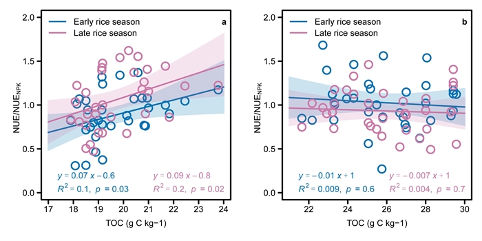 秸秆还田(a)及秸秆源生物质炭(b)施用下氮肥利用率比值随土壤总有机碳含量的变化