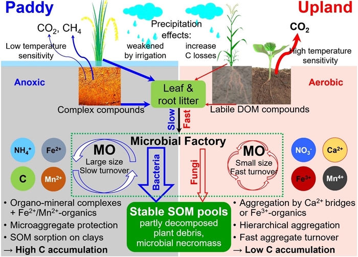 水稻土是在长期淹水条件下形成的特殊土壤,具有微生物生物量大,管理类型广泛的特点。与旱地土壤不同,水稻土具有特殊的氧化还原过程,影响养分循环利用以及微生物介导的土壤有机质(SOM)周转。因此,稻田与旱地的SOM形成和保存机制有很大的差异,导致其土壤有机碳(SOC)和全氮(TN)含量明显高于旱地土壤。然而,这一现象的内在机制还缺乏系统地揭示解释。