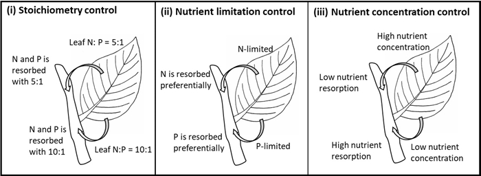 叶片养分回收是植物保存养分的一种重要机能。关于叶片养分回收的研究已有一个世纪的历史。然而该领域的核心问题仍不清楚,即,植物叶片是如何回收养分的?通过对前人研究的总结,研究人员首次归纳了植物养分利用策略的三个基本策略:1)化学计量控制的策略;2)养分限制控制的策略和3)养分浓度控制的策略(图 1)。