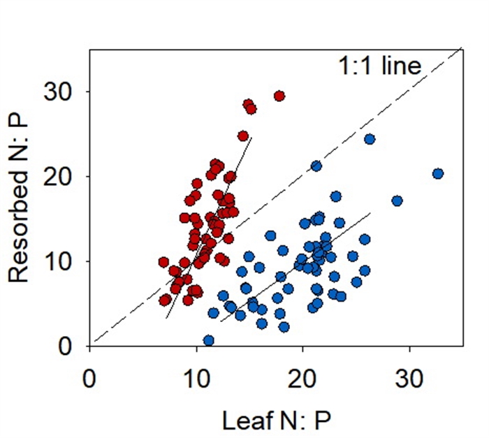 然而,这些策略是否能够共存以及植物何时用何种策略仍然不清楚。为回答这些问题,研究选择了两个养分状态完全不同的森林生态系统。一个是喀斯特森林,一个是非喀斯特森林。喀斯特森林的特点是土壤氮和磷含量高,植物受氮限制 (叶片N:P <14)。非喀斯特森林的特点是土壤氮和磷含量低,植物受磷限制 (叶片N:P >16)。这两个养分差异显著的生态系统为研究人员研究植物养分回收策略提供了非常好的平台。