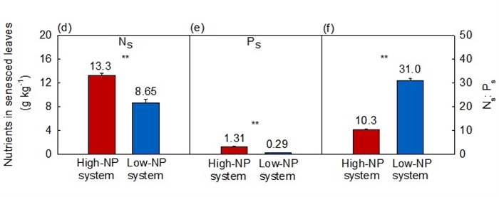最后,养分浓度控制(策略iii)也被发现(图4):衰老叶片的平均N浓度(Ns)为12.8 g kg-1(> 10 g kg-1),平均P浓度(Ps)为1.28 g kg-1(> 0.8 g),说明在高N和P的喀斯特森林生态系统中养分吸收是不完全的。然而,在低N和P的非喀斯特森林生态系统中,Ns为8.37 g kg-1(接近7 g kg-1),Ps为0.26 g kg-1(<0.5 g kg-1),表明在养分被完全吸收。