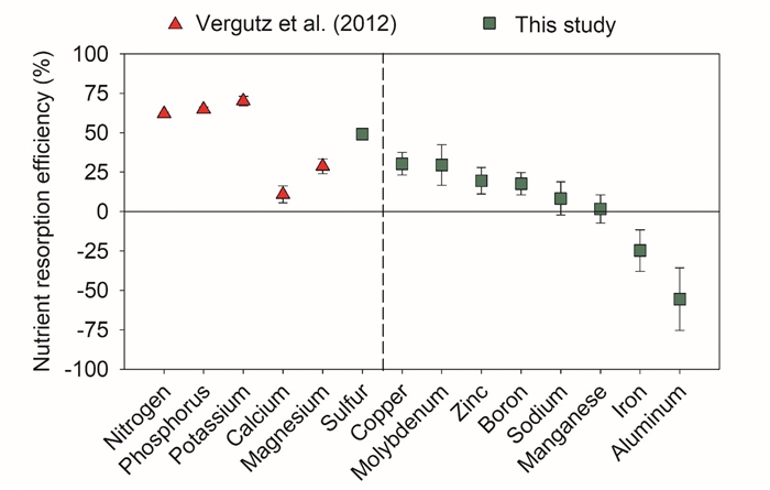此外,为了填补目前关于叶片微量养分回收全球格局的空白,研究者收集并提取了53项已发表的文章的相关数据,研究了8种微量元素的叶片重吸收效率,包括铜(Cu)、钼(Mo)、锌(Zn)、硼(B)、锰(Mn)、钠(Na)、铝(Al)和铁(Fe)。研究人员发现,在8种微量元素中,重吸收效率从高到低依次为:Cu(30.3%)、Mo(29.5%)、Zn(19.5%)、B(17.6%)、Na(8.3%)、Mn(1.6%)、Fe(-24%)和Al(-55.6%)。其中,Fe和Al的负吸收效率意味着这些元素不会被植物重吸收,反而是在老叶中积累(图 5)。这些研究结果是对前人研究的重要补充(Vergutz et al. 2012),为理解植物叶片养分重吸收提供了更全面的知识。研究强调:结构性元素(即Ca、Mg、B、Na和Mn)和潜在的有毒元素(即Fe和Al)的叶片重吸收效率相对较低,甚至没有。这些特殊性应在生物地球化学模型中得到充分的考虑。