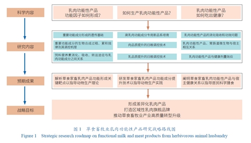 中国科学院亚热带农业生态研究所谭支良研究员领衔的农牧复合草食家畜健康高效养殖与生态服务研究团队,收集和整理草食家畜乳肉功能性成分调控的相关文献资料并结合团队的前期工作,剖析了草食畜牧业乳肉功能性产品研究的前沿科学和技术问题,提出了我国草食畜牧业乳肉功能性产品研究的战略路线(图1)。发展草食畜牧业乳肉功能性产品的主要路径包括利用遗传改良方法培育新品系、调控日粮配方改变功能成分合成过程、靶向合成草食家畜乳肉功能成分前体物质三个方面。其中,在调控日粮配方改变功能成分合成过程方面,团队前期研究发现在肉羊日粮中添加3.0-4.0g/kg 儿茶素可有效改善肉羊肌肉品质,提升肌肉中不饱和脂肪酸的比例;在泌乳羊日粮中增加单宁,羊乳中单不饱和脂肪酸及多不饱和脂肪酸含量随日粮中单宁添加量增加而线性增加。