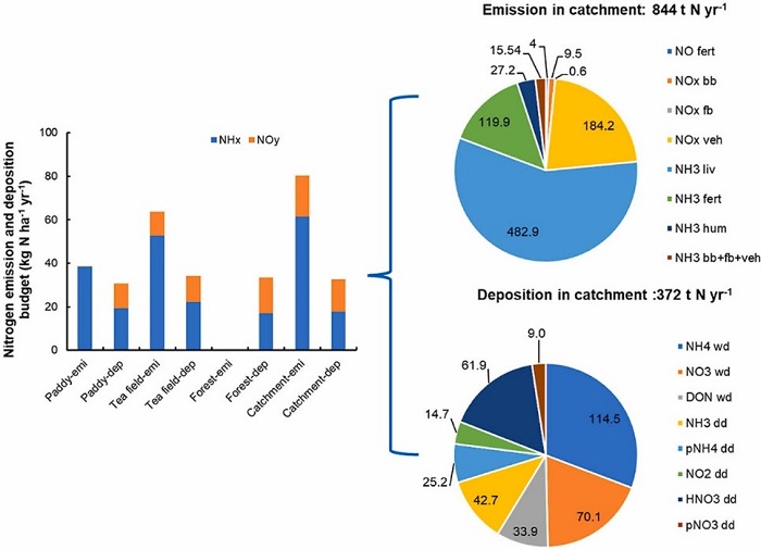 基于此,中国科学院亚热带农业生态研究所土壤生态与环境课题组以典型亚热带农业小流域-金井河流域为研究对象,监测了流域内三种主要土地利用类型(稻田、森林和茶园)的大气活性氮干、湿沉降。同时,基于排放因子法,通过流域调查和文献调研获取活动数据,编制了流域NH3和NOx排放清单。结果表明流域内大气活性氮总沉降量为35.9 kg N ha-1 yr-1,其中还原态(NHx)与氧化态(NOy)活性氮分别占49.7%和40.5%。流域内NH3排放与NOx排放速率分别为61.5和18.9 kg N ha-1 yr-1。其中畜禽源和交通源分别是NH3和NOx排放清单的主要排放源。综合流域内排放与沉降研究可知稻田、森林和茶园的净大气活性氮收支分别为+3.7、-36.1和+23.8kg N ha-1 yr-1,而流域尺度为+47.7kg N ha-1 yr-1(+为排放,-为沉降)。这表明森林是重要的大气活性氮的汇,而亚热带农业小流域或是大气活性氮的源。由于过量的大气活性氮排放和沉降可能对环境产生不利影响,应增加森林种植面积并采取减排措施以减少农业和交通运输的氮排放。