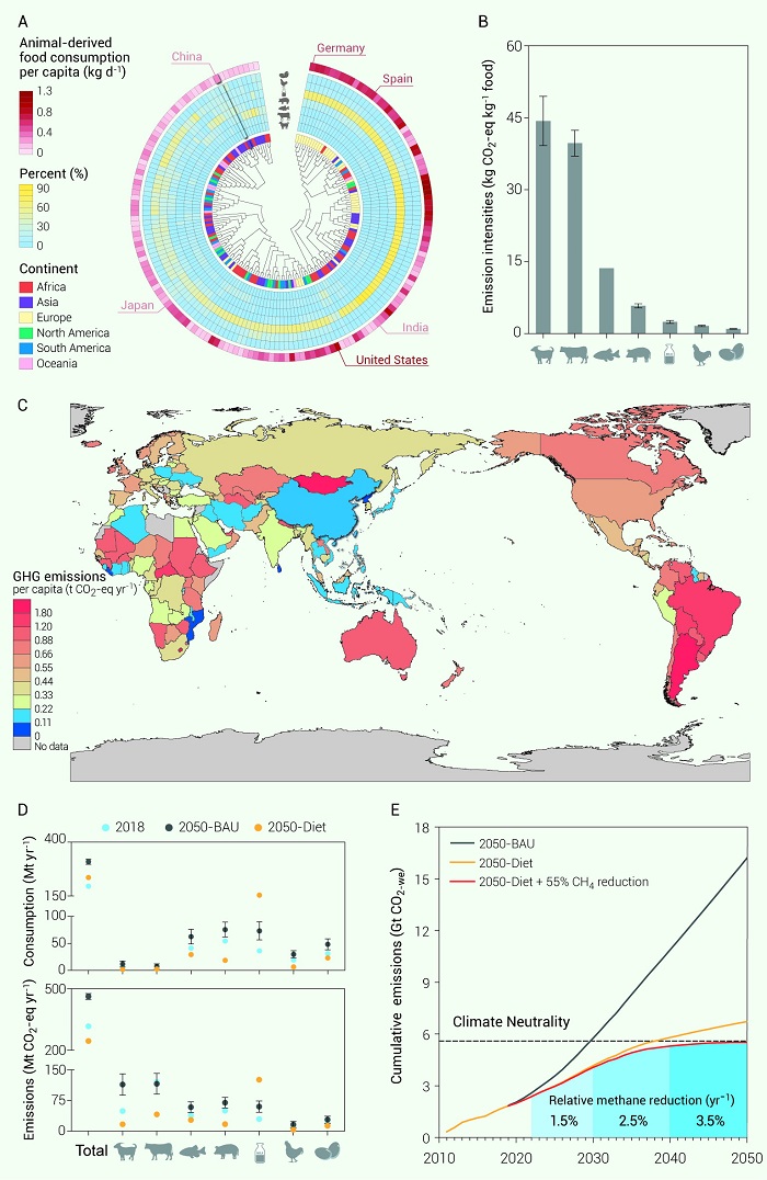 图A,2018年全球168个国家动物源食品消费量及组成; B,动物源食品的碳排放强度;C,2018年各个国家人均动物源食品消费相关的温室气体排放量;D,动物源食品消费及其相关的温室气体排放,其中2050-BAU代表基准情景,2050-Diet代表膳食标准;E,不同情景下中国畜牧业累积的二氧化碳增温潜势,其中虚线代表达到气候中性。