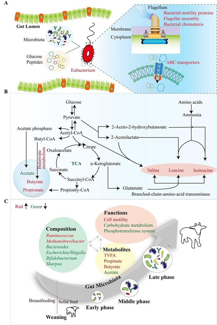代谢蛋白组成调控关键营养素利用效率的微生物机理。图A,HRUP干预诱导Eubacterium定植,通过其自身的鞭毛运动向营养物质趋动,并利用ABC转运载体吸收营养物质;图B,HRUP增强了丁酸代谢途径,将微生物代谢从产乙酸转变为产丁酸和支链氨基酸(缬氨酸、亮氨酸和异亮氨酸);图C,肠道微生物组成、功能和代谢物随时间的动态变化规律。红色字体表示增加,绿色字体表示减少。