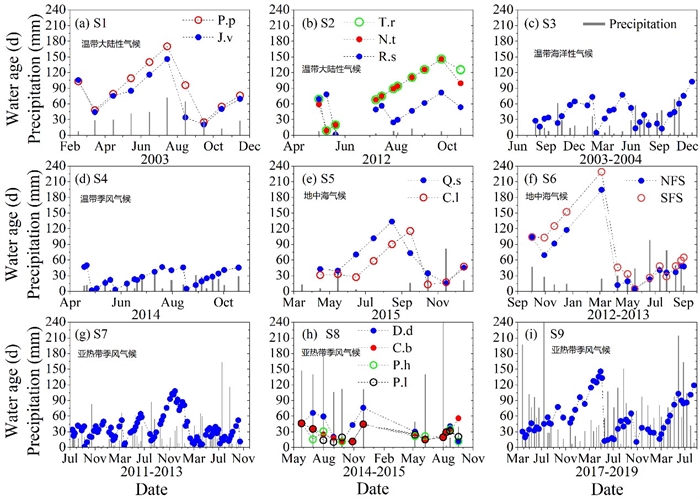 针对以上问题,中国科学院亚热带农业生态研究所陈洪松课题组依托环江喀斯特站植物-水分关系研究平台,并综合文献数据,利用稳定同位素示踪技术,估算了植物根区水分被降水(新水)补给的比例,基于根区新旧水比例,采用分段线性混合式水龄(滞留时间)模型计算了植物蒸腾水龄的季节变化(反映植物水分利用的时间来源)。对比分析了不同气候类型(温带大陆性气候、温带海洋性气候、温带季风气候、地中海气候和亚热带季风性湿润气候)下典型植物蒸腾水龄的季节动态及其影响机制。