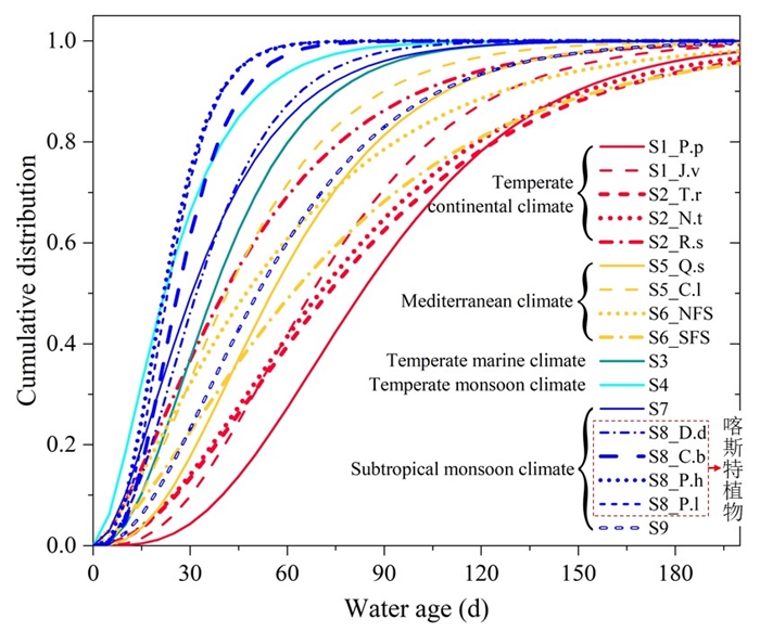 不同气候区植物蒸腾水龄的累积分布