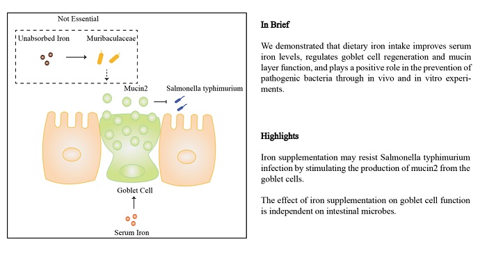 为了评估足够的膳食铁摄入是否有助于抵御病原性细菌感染,给小鼠饲喂缺铁(2 mg Fe/ kg饲料)、铁充足(35 mg Fe/ kg饲料)或铁富集饲料(350 mg Fe/ kg饲料)12周,随后将鼠伤寒沙门氏菌以灌胃方式感染小鼠。研究结果表明,膳食铁的摄入量可改善肠道黏液层的功能,并减缓了鼠伤寒沙门氏菌的入侵。小鼠的血清铁浓度与杯状细胞数量及黏蛋白表达呈正相关。肠道中未吸收的铁可影响肠道微生物群的组成,并且拟杆菌Muribaculace丰度与黏蛋白表达呈正相关。然而,抗生素处理小鼠的结果表明,膳食铁调节黏蛋白层功能不是微生物依赖性的。此外,体外研究表明,微量元素铁可以直接诱导回肠和结肠类器官中杯状细胞黏蛋白的表达。由此可见,膳食铁摄入可提高血清铁水平,调节杯状细胞增殖和黏蛋白层功能,对病原菌的入侵起到了积极的防御作用。