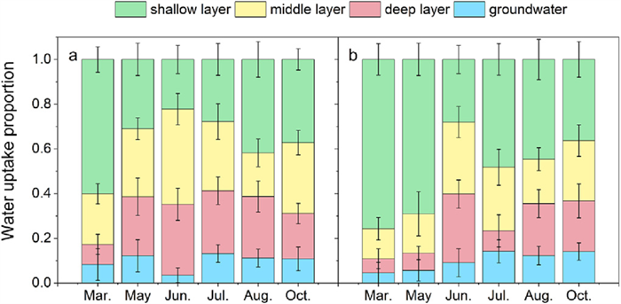 研究结果发现,上坡的土壤-表层岩溶带平均含水量为0.084~0.194m3 m-3,仅为下坡的45.3~69.8%左右,沿坡水分供应存在显著差异;上下坡盐肤木植物枝条水同位素相近,lc-excess偏负,结合MixSIAR模型分析可知,沿坡面盐肤木的吸水策略相似,均以利用0至60cm土壤水为主;上坡盐肤木蒸腾速率和蒸腾量降低至下坡的一半左右。下坡土壤水分相对充足,植物蒸腾随大气蒸发需求的变化而改变,上坡水分供应限制了植物蒸腾及蒸腾对大气蒸发需求的敏感性。本研究表明喀斯特地区自然恢复的次生植物蒸腾多依赖土壤水,且不能通过吸收深层水补偿由坡位效应引起的蒸腾差异。本研究进一步揭示出土壤水分仍是影响西南喀斯特土石混合生境演替初期植被恢复的限制因子,植物在上坡通过降低蒸腾的方式适应干旱环境。