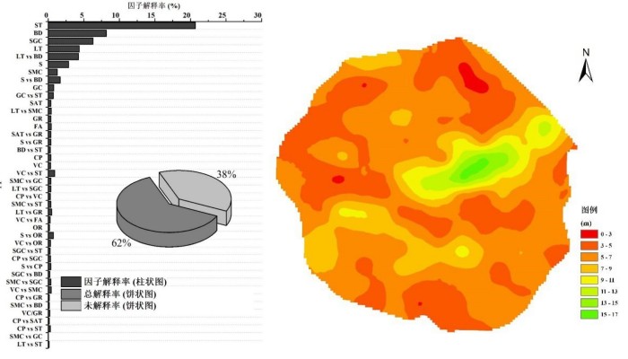 基于地球物理勘探技术量化了小流域土壤和表层岩溶带厚度空间分布及其影响因素。小流域平均土壤厚度(1.1 m)远低于表层岩溶带厚度(6.3 m),两者在空间上高度正相关,随海拔增加而减小。坡地占小流域总面积的79%,仅贡献了47%的土壤体积,平均土壤和表层岩溶带厚度远浅于洼地(图1)。地形、土壤性质和植被类型对表层岩溶带厚度的总解释率高达63%,其中土壤厚度(21%)、土壤容重(8%)、土壤碎石含量(6%)是影响其发育的主要因素(图2)。