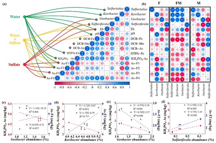 灌浆期各处理细菌丰度(Candidateus、Koribacter、Geobacter和sulphitalea)与土壤理化指标之间的关系(a)。3种水分管理下4种细菌丰度与上述土壤理化指标的关系(b)。F处理下Geobacter丰度与KH2PO4-As、As-F4的关系(c)。FM处理下Koribacter丰度与KH2PO4-As、As-F3的关系(d)。M处理下,Geobacter丰度与KH2PO4-As、As-F2的关系(e)。sulphitalea丰度与KH2PO4-As、As-F2的关系(f)。