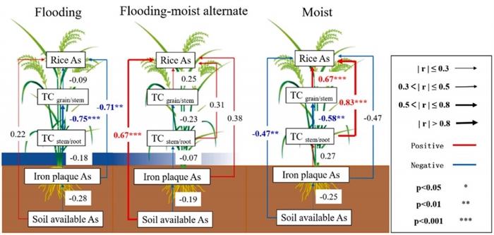 三种水分管理下土壤有效态砷、铁膜砷、茎/根、籽粒/茎和水稻砷之间的结构方程模型(SEM)
