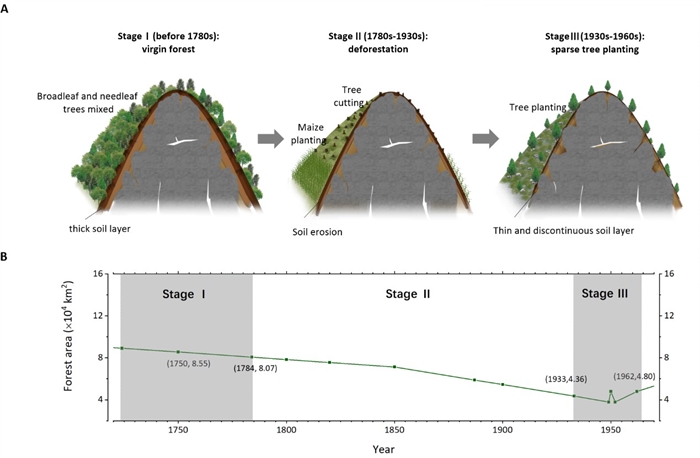以造林为核心的森林景观恢复(Forest Landscape Restoration)是“波恩挑战”和“联合国生态系统恢复十年”等国际生态恢复计划的共同目标,但造林并不等于恢复,以树为核心的恢复可能会导致错位修复、甚至原有完整生态系统的破坏。大规模生态保护与修复下,我国西南喀斯特地区已成为全球 “变绿”的热点区之一,但可溶性碳酸盐岩脆弱地质背景制约“变绿”的可持续性,过去20多年大规模人工造林与自然封育下,依然存在部分喀斯特地区难以自然恢复成森林景观、造林也难以成林。了解历史时期区域植被变化和石漠化历史是回答当前及未来喀斯特地区造林可持续性和潜力的关键。据史料记载,历史时期、特别是明清时期,喀斯特地区已有人为毁林与开垦导致的石漠化发生,但以往关于喀斯特区历史时期石漠化和人类活动的研究主要借鉴历史文献记载,缺乏有效的科学实证。
