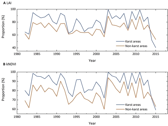 图2. 年降水量低于阈值的喀斯特区域/非喀斯特区的比例