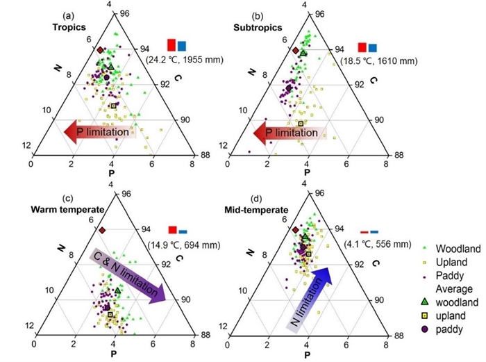 基于大样本分析,发现我国东部四个气候带相邻稻田、旱地和林地表层土壤C、N、P的含量和计量比呈现大致一致的特征:与相邻林地相比,长期旱地利用降低C含量、增加P含量,造成C:N、C:P和N:P降低;稻田较林地C、N、P含量均增加,但N、P增加幅度高于C,导致C:N、C:P降低;南方比北方对农业利用的响应更强烈。区域尺度上土壤元素限制规律:四个区域旱地均呈现出的C、N限制和P富集,亚热带林地表现为P限制,暖温带地区C、N限制(图1)。