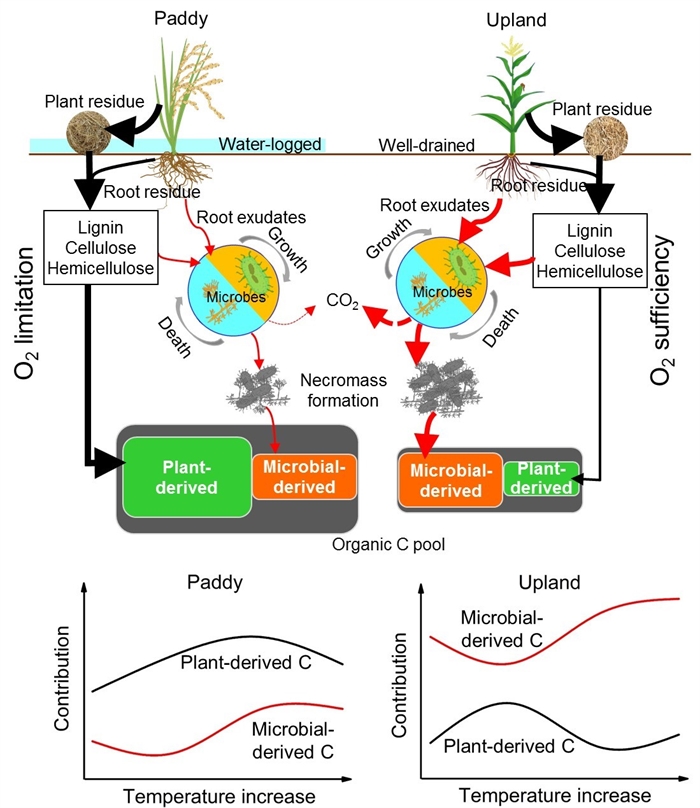 分析四个气候带240对相邻稻田和旱地土壤有机碳含量,发现稻田土壤有机碳积累效率比相邻旱地土壤高39%~127%,且以亚热带地区差异最大,突出了该区稻田土壤强大的固碳能力。进一步量化了两类土壤中植物残体和微生物残留物来源碳对总有机碳积累的贡献,发现长期稻作下土壤积累的有机碳以植物残体(33%~54%)大于微生物残留物(28%~36%),而旱作下以微生物残留物(40%~59%)大于植物残体(19%~42%),且稻田土壤中植物残体来源碳的数量是旱地土壤的3.3倍,即稻田土壤突出的碳固持能力归因于植物残体大量积累。基于此,构建了稻田和旱地土壤有机碳形成途径的理论模型(图2)。