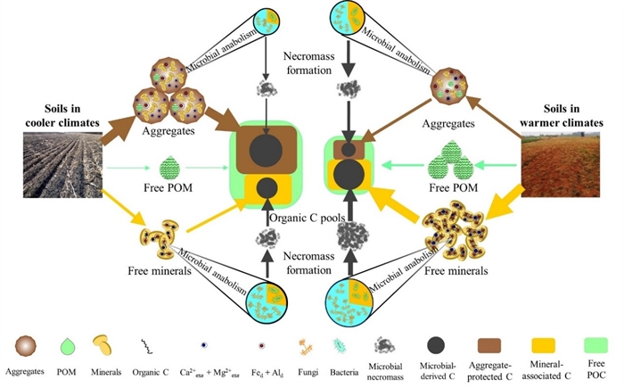 南方和北方气候条件、土壤属性、耕作频率差异极大,可能影响土壤有机碳积累的团聚体和矿物保护以及微生物代谢过程。采用密度和粒径分级结合同位素示踪试验,发现:团聚体保护态有机碳对稻田和旱地全土有机碳积累的贡献从北到南减少;游离矿物结合态有机碳的贡献率呈递增趋势;微生物残体碳对游离矿物结合态有机碳的贡献率从北到南增加。因此,我国东部北方农田土壤有机碳积累受团聚体保护主导,南方受矿物保护主导,且北方微生物合成代谢对有机碳积累的参与程度弱于南方(图4)。