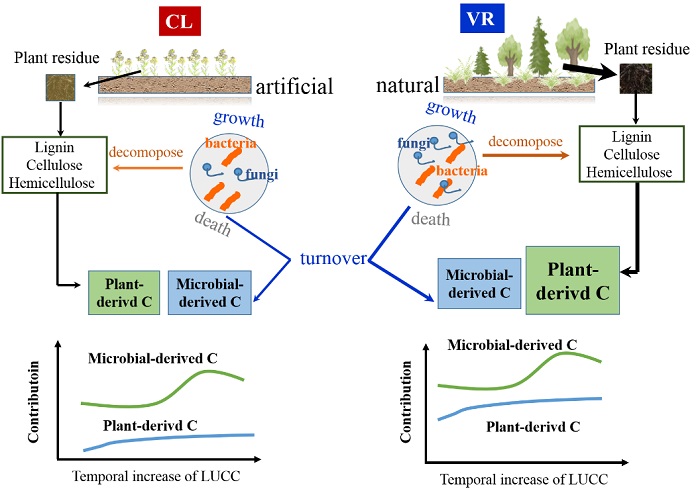 中国科学院亚热带农业生态研究所农田生态中心研究人员依托中国科学院桃源农业生态试验站不同土地利用方式长期定位试验(1995年-),研究发现24年土地利用/覆被变化(LUCC)过程中,早期(农田<15年,自然恢复<10年)活性有机碳(LOC)显著下降,而稳定性有机碳(SSOC)显著增加,SOC整体变化不大;随后SOC、LOC和SSOC均呈现增长趋势,SSOC对SOC的增长起主导作用。自然恢复和农田土壤微生物残体碳对SOC的贡献比例较大,但两种土地利用方式下差异不显著。与农田相比,自然恢复土壤中较高的SOC含量归因于植物来源碳对SOC的贡献。优势菌群和土壤氮含量是调节农田和自然恢复土壤微生物源和植物源碳的主要生物和非生物因子。本研究在同一田块尺度揭示SOC时间变化规律及微生物调控机制,强调了植物和微生物来源碳对长期SOC固持的协同作用,提升了对亚热带红壤碳循环特征的认识,并为全球基于自然的气候解决方案提供科学依据。