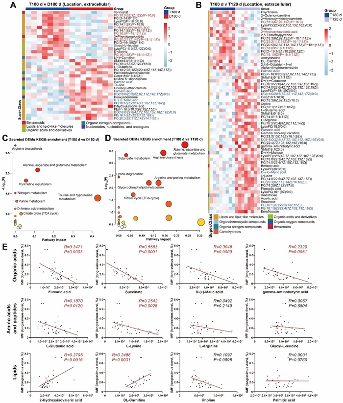 该研究通过对不同日龄桃源黑猪和杜洛克猪的背最长肌组织进行非靶向代谢组学分析,结合脂肪沉积表型数据,研究人员首先确定了桃源黑猪脂肪沉积和肉品质形成的“窗口期”为120至180日龄。代谢组与转录组联合分析揭示“窗口期”日龄与品种间背最长肌代谢差异主要富集在能量、脂质和氨基酸蛋白质代谢相关通路。随后鉴定了数十种180日龄桃源黑猪背最长肌的特异性代谢产物。