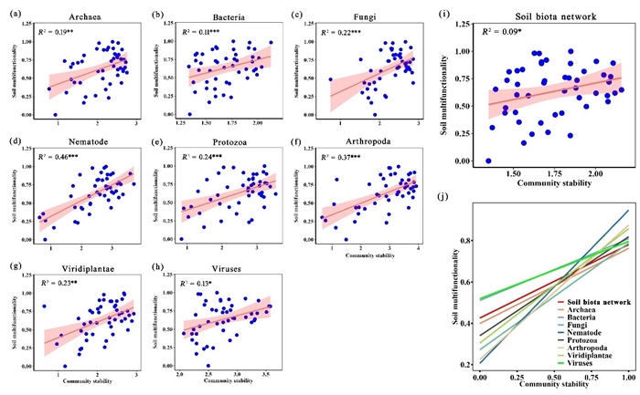 研究发现,农业干扰强度的增加提高了物种之间的竞争,因此增加了土壤生物网络的复杂性,但却减少了土壤生物网络稳定性。土壤微动物(线虫、原生动物和节肢动物)可以通过自上而下的控制作用稳定整个土壤生物群落。进一步的分析发现,是土壤生物网络稳定性而不是土壤生物网络复杂性或土壤生物多样性能预测土壤多功能性的动态。具体而言,一个稳定的土壤生物群,包括细菌、真菌、古菌、线虫、原生动物、节肢动物、病毒和藻类,支持高的土壤多功能性。特别是,土壤微动物群稳定性比其他的生物群对土壤多功能性有更大的贡献。总的来说,研究结果强调在全球农业集约化不断增加的背景下,土壤生物网络稳定性应该被考虑为提高农业可持续发展和作物产量的关键因素。