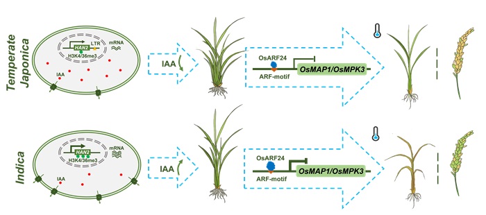 中国科学院亚热带农业生态研究所联合多家单位在Nature Communications发表题为Suppressing an auxin efflux transporter enhances rice adaptation to temperate habitats的研究论文,阐述生长素外排转运蛋白HAN2/OsABCB5通过生长素信号通路调控水稻低温环境适应性的分子机制。该研究获得两个新发现:① 生长素转运及其信号通路调控水稻低温环境适应性的遗传基础,② Copia逆转座子介导的表观遗传修饰驱动籼粳适应性分化的分子机制,为培育气候韧性水稻品种提供新的理论依据与基因资源。