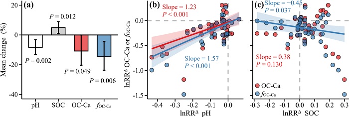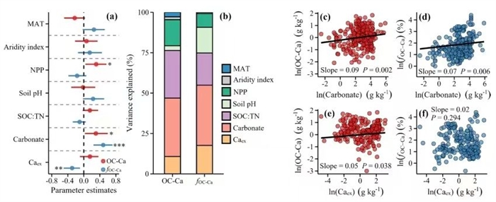 研究发现,OC-Ca约占SOC库的 8%,且在旱区和农田生态系统储量最为丰富。融合多层次与探索性统计分析,结果表明,全国尺度土壤无机碳是预测OC-Ca积累的主导因子。水分通过调节土壤pH和碳酸盐沉淀,间接驱动OC-Ca的空间格局。相比之下,交换性钙与OC-Ca的关联较弱,甚至呈负相关,这挑战了传统观点。研究还表明,尽管氮富集促进了SOC储存,但却导致OC-Ca库的损失。这一发现凸显了氮富集可能削弱SOC稳定性的潜在风险,为评估全球变化的生态后果提供了关键科学依据。总的来说,这项工作将土壤无机碳(碳酸盐)与特定SOC组分的固存联系起来,强调了其在SOC固持和稳定中长期被忽视的贡献。研究成果不仅深化了对SOC稳定机制的理解,也为制定针对性的土壤固碳管理策略提供了理论支撑。
