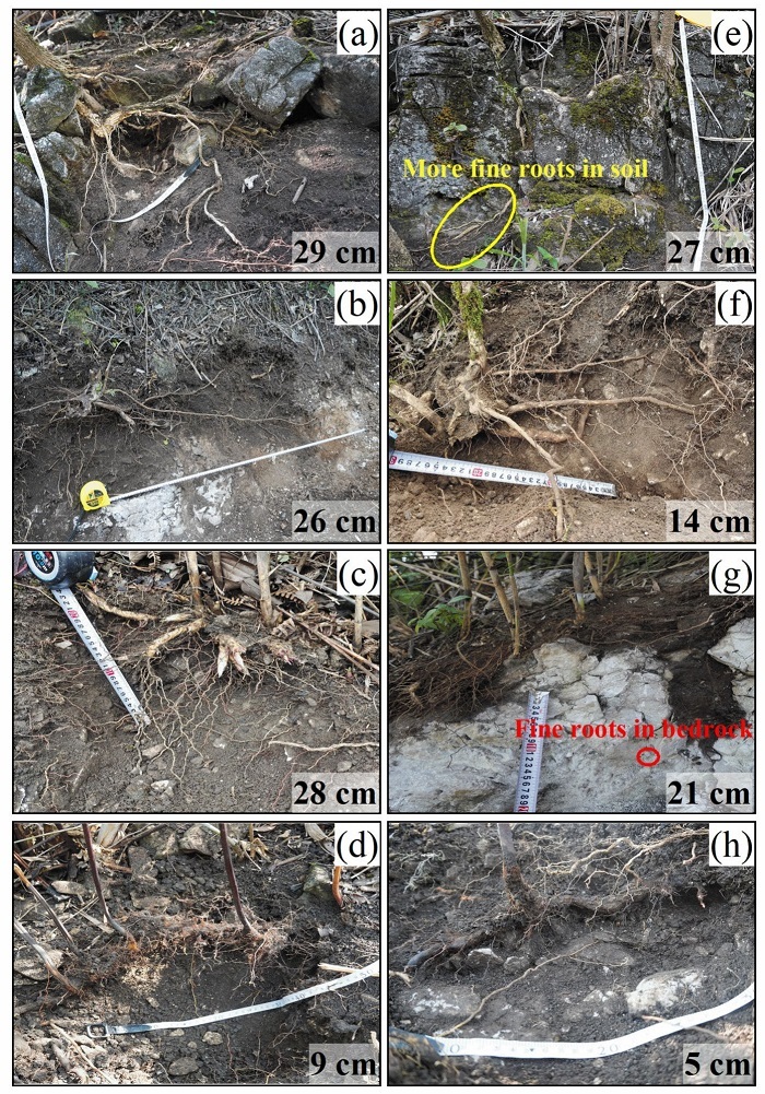米念芭(a、e)、黄荆(b、f)、类芦(c、g)和铁芒萁(d、h)在不同土壤深度(左列大于20厘米,右列小于10厘米)生境中的根系分布模式,照片中的数值表示观测到的最大根系深度