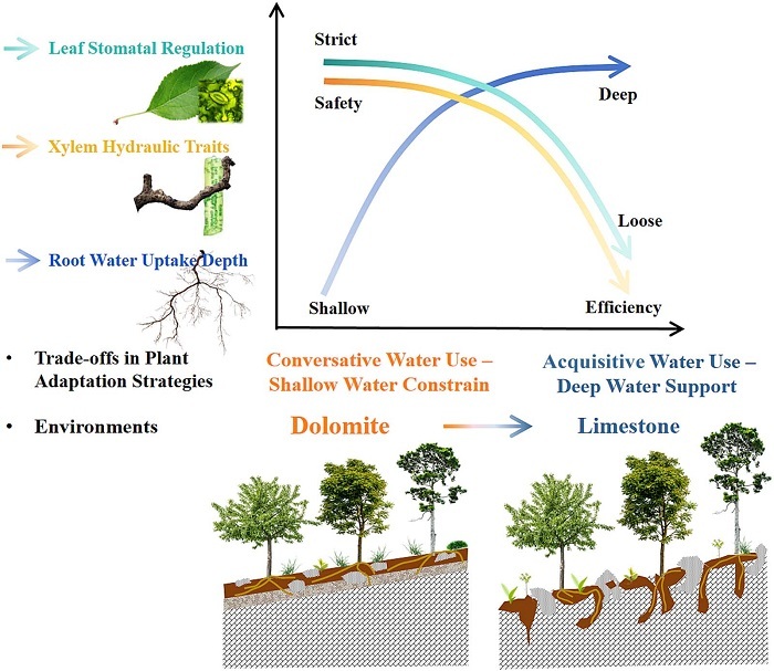 然而,在物种共存的基础上,不同基岩类型下的植物是否采取一致的水分利用策略?研究团队进一步系统分析了石灰岩与白云岩共有的五种典型喀斯特恢复乔木的根系吸水来源、枝条水力特性和叶片碳氧获取能力相关指标。结果表明,石灰岩植物呈“获取型”策略,具有深层稳定的水源,可牺牲水力安全性以提升水力效率和叶片碳氧获取能力。白云岩植物呈“保守型”策略,根系受限于易波动的浅层水源,但其发育出较强的水力安全性和较低的碳氧获取能力以降低水力失衡风险。研究揭示了植物水分利用性状在“根—木质部—叶片”连续体中存在的系统性权衡关系。浅层水分依赖越强,植物的水力安全性越强,水分利用效率越高,但生长速率受限;而深层水分获取越多,植物的水力效率越高,气孔调节越宽松,但抗干旱风险的能力相应下降。这种地下与地上功能性状之间的协调与权衡,构成了喀斯特树种适应不同基岩环境的生理生态基础。