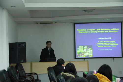 2月20日,加拿大卫生部食品署营养局分子营养室研究员、渥太华大学细胞分子医学系联合教授肖朝武应邀访问中科院亚热带农业生态研究所,并为该所师生做了题为“蛋白质与生物活性物质对机体脂质代谢及基因表达影响”的学术报告。亚热带生态所副所长谭支良主持报告会。