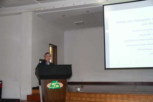 Chien-An Andy Hu以“Proline and Tryptophan Metabolism in Human and Animal”为主题,介绍了其研究团队在氨基酸代谢与癌细胞凋亡/自嗜调控、抗癌药物筛选等方面的最新研究进展。该所畜禽健康养殖研究中心科研人员就动物脯氨酸和色氨酸代谢通路调控与生理功能、细胞凋亡与自嗜相互调节信号通路、脯氨酸和色氨酸在动物饲料中的应用前景等方面,与Hu进行了热烈讨论和深入交流,并详细制定了近期的合作研究与人员交流计划。之后,在孔祥峰博士陪同下,Hu参观了该所重点实验室和动物与作物实验楼。Hu对所相关研究基础和科研条件给予了高度评价,并对今后双方的科研合作充满信心。