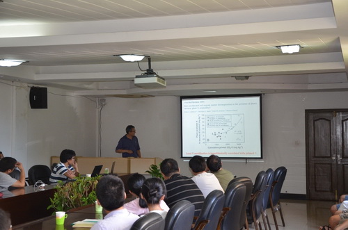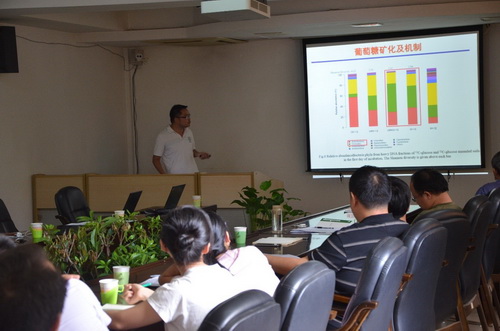 程维信做了题为土壤有机质矿化的根际激发效应与温度敏感性(Rhizosphere priming and temperature sensitivity of Soil organic matter decomposition)的学术报告,报告详细阐述了根际激发效应的过程、机制及其对气候变化的响应、大气CO2浓度升高和大气增温背景下的土壤碳氮循环过程,程维信结合他30多年的科研经验和在土壤碳氮循环方面取得的研究成果,对开展亚热带地区稻田土壤碳氮过程提出了宝贵的意见和建议。朱宝利做了题为微生物碳、氮循环中的新发现:甲烷的厌氧氧化和‘产氧反硝化’途径(Novel microbial processes in carbon and nitrogen biogeochemical cycles: anaerobic oxidation of methane and ‘oxygenic denitrification’)的报告,报告从微生物学角度阐述了湿地生态系统甲烷氧化的新途径及其机制。罗煜做了题为土壤梯度碳源的微生物降解及机制的报告,分析比较了葡萄糖、纤维素、生物质碳及其多种碳源混合条件下,土壤外源碳周转的微生物机制。葛体达和祝贞科分别做了题为稻田土壤生物固碳机制研究和水稻根际激发初探的报告,介绍了近年来吴金水研究员团队在稻田土壤碳循环方面开展的研究工作,并与参会的各位老师进行了深入的交流与讨论。