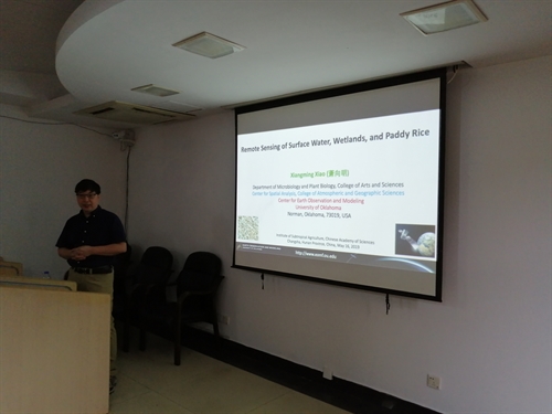 肖向明作了题为Remote sensing of surface water, wetlands and paddy rice croplands的学术报告,系统介绍了他和团队在水体遥感研究领域多年的成果。报告指出遥感是艺术和科学的结合,并对遥感原理、遥感数据源及其获取、数据挖掘和算法分析等进行了生动地介绍,最后,就遥感在地表水体、湿地、稻田和禽流感风险遥感监测等方面的应用进行了案例分析。双方就喀斯特高异质性生态参量遥感反演方法、人工林与天然林遥感专题制图、研究人员访学交流等方面达成合作意向。