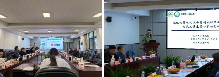 谭支良致欢迎词。重点实验室副主任孔祥峰研究员从实验室概况、2024年度工作、存在问题及下年度工作计划等方面作了省重点实验室工作报告,实验室成员王乐莅副研究员,孙敬春、高虎、殷诗舒、赵曦晨、赖辛、胡睿智、刘栓、张峰、李婉、马勇等特聘研究助理,分别以绿原酸抗炎能力、低遗传力性状基因组选择、肌内脂肪沉积、高品质猪肉形成机制、化肥减量配施发酵沼液对水稻与土壤的影响、仔猪铁营养与巨噬细胞稳态和肠干细胞命运、公猪精液品质及其改善、仔猪肠道损伤机制、利用生物质合成氨基酸饲料、色氨酸调控猪流行性腹泻机制、新生仔猪肠道微生物、氨基酸代谢及肠道免疫互作机制等为主要内容作了学术报告。
