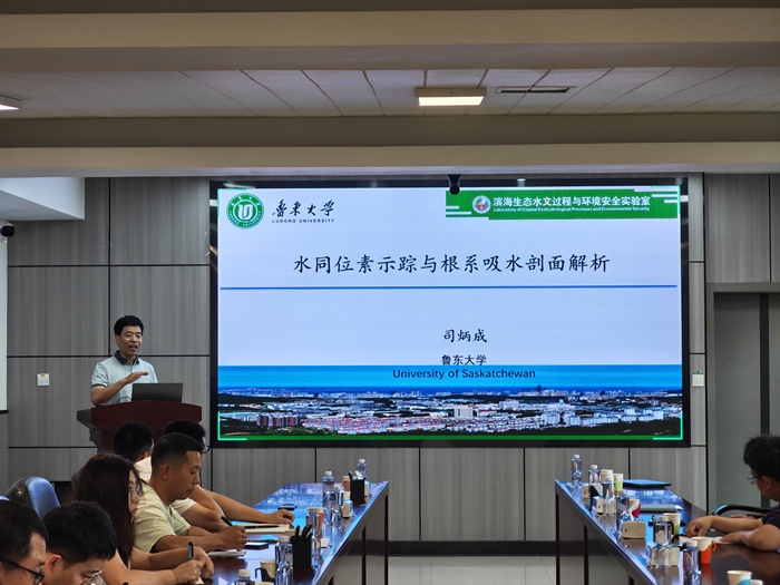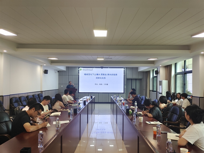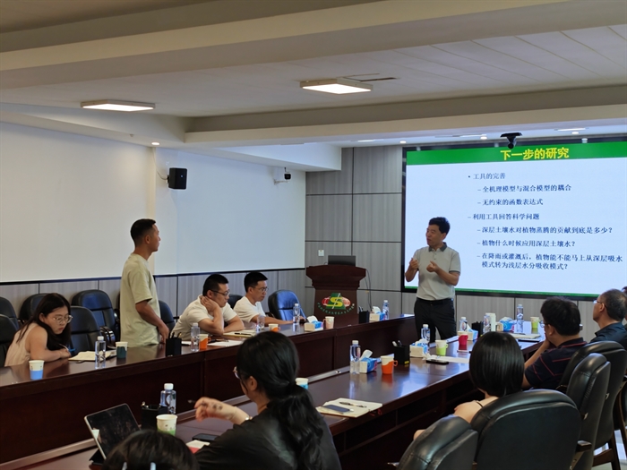 交流会上,司炳成以“水同位素示踪与根系吸水剖面解析”为题作学术报告。他针对应用同位素技术区分植物水源的三个局限性问题,向与会科研人员详细阐述了其通过构建“连续型”剖面根系吸水模型和根系吸水机理模型,降低同位素估算植物水源的不确定性、提高准确性的最新研究成果。李志以“植被变化下土壤水-蒸散发-降水的链条式转化关系”为题,介绍了黄土高原植被变化对蒸散发和降水量的增加效应,不同植物的吸水模型改变了土壤水的平衡,消耗的土壤水贡献了蒸散发增幅的59%,而蒸散发增幅的19%转化为了当地降水,从草地,到灌木和林地的水汽再循环率逐渐增加。