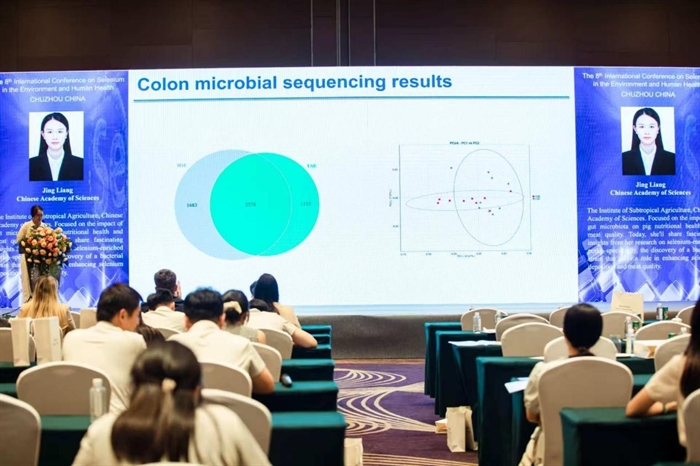 开幕式上,中国工程院印遇龙院士受邀在线上作“Selenium-Enriched Livestock Products and Human Health”的主旨报告,系统梳理了国内外在富硒畜禽产品与人体健康领域的最新研究进展,深入揭示了二者之间的科学关联与潜在价值。在专题报告环节,印遇龙院士团队2024级博士研究生梁璟作了“Dietary Supplementation of Prevotella copri Enhances Selenium Accumulation in Pigs”的报告。该研究通过肠道微生物组分析,筛选获得了影响猪体内硒沉积的关键菌Prevotella copri,并通过实验验证了其调控效果。研究为通过微生物干预提升畜禽硒营养水平提供了全新思路和科学依据。