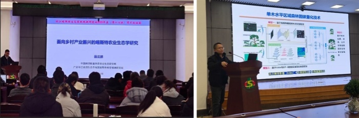 站长王克林研究员总结了环江站2025年在科研项目承担、科研成果产出、人才培养以及台站运行发展等方面的情况,提出环江站观测研究示范服务工作应在聚焦台站应用基础研究优势的同时,紧密结合国家需求,支撑“以喀斯特生态系统服务提升破解区域农业生态问题”。他作了“聚焦石漠化治理工程持续性需求,支撑喀斯特区域农业转型升级与科学决策”的报告。喀斯特生态水文、生物地球化学、循环农业、区域生态等研究组组长、科研骨干及青年研究人员,分别就喀斯特流域关键带生态水文模型构建与应用、面向乡村产业振兴的喀斯特农业生态学研究与道地中药材产业示范、桑园土壤生态功能提升探索、喀斯特区森林恢复与地质约束以及碳汇计量等多个专题开展交流。此次学术交流会促使环江站站内各研究方向再次展开思想碰撞与智慧交融,为站内学科交叉融合,凝练研究方向创新点,提供了良好的沟通平台。
