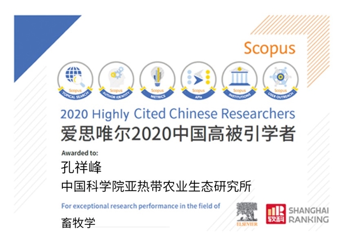4月22日,2020年爱思唯尔(Elsevier)中国高被引学者(Highly Cited Chinese Researchers)榜单正式发布,中国工程院院士、中国科学院亚热带农业生态研究所印遇龙研究员再次入选(2016、2017、2018、2019、2020),畜禽健康养殖与农牧复合生态研究中心主任孔祥峰研究员首次入选,标志着该团队在畜牧生态领域的国际学术影响力进一步扩大。