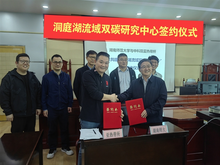 5月16日,由湖南师范大学与中国科学院亚热带农业生态研究所共建的“洞庭湖流域双碳研究中心”在中国科学院洞庭湖湿地生态系统观测研究站签约挂牌,全球知名学者、湖南师范大学彭长辉教授及其研究团队,洞庭湖站站长谢永宏研究员、副站长李峰研究员等科研骨干参加签约仪式。