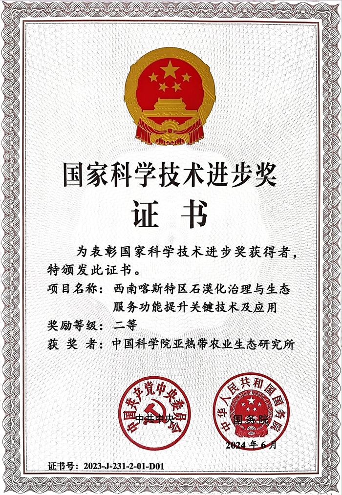 6月24日,2023年度国家科学技术奖励大会在北京召开。中国科学院亚热带农业生态研究所为第一完成单位的“西南喀斯特区石漠化治理与生态服务功能提升关键技术及应用”成果荣获国家科学技术进步奖二等奖。