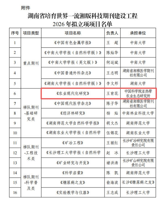 近日,湖南省科学技术厅公示了湖南省培育世界一流湘版科技期刊建设工程2026年拟立项项目名单,《农业现代化研究》成功入选梯队期刊(基础研究类)。这是期刊发展取得的重要突破,也标志着其学术质量和影响力获得省级权威认可。