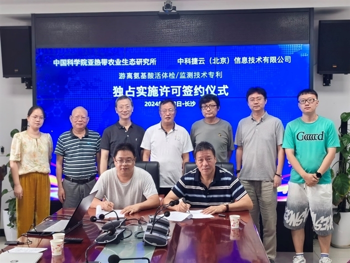 7月3日,中国科学院亚热带农业生态研究所印遇龙院士团队与中科捷云信息技术有限公司在长沙举行游离氨基酸检测技术专利独占实施许可签约仪式。