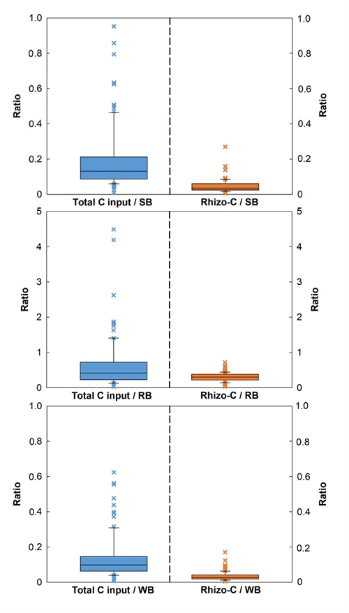 鉴于同位素示踪技术费用高昂,而且需要专业的知识和特殊的分析设备,因此目前该技术的使用还不是非常普遍,因此该团队还建立了一种快速和简便估算水稻生态系统地下碳和根际沉积碳数量的方法。考虑到水稻不同组织之间以及根系和根际沉积之间相对稳定的比例关系,该团队发现可以一个相对系数来估算水稻生态系统地下碳和根际沉积碳的数量,即用水稻的某个组织的生物量乘以该系数便可大致速算出水稻的地下碳和根际沉积碳的含量。发现,水稻总地下碳量的估算系数为:水稻茎叶生物量的0.24,水稻根系的0.79和水稻总生物量的0.17;而根际沉积碳数量的估算系数为:水稻茎叶生物量的0.06,水稻根系的0.28和水稻总生物量的0.04(图2)