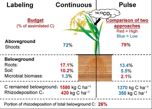 此外,该团队还估算了水稻地下碳输入量和根际沉积碳的数量,发现利用连续标记方法,水稻一个生长季地下碳输入总量为1.58Mg ha-1,其中根际沉积碳占0.42Mg ha-1。而利用脉冲标记方法估算的碳输入量则略低(总地下碳输入,1.37Mg ha-1;根际沉积碳,0.35Mg ha-1)。