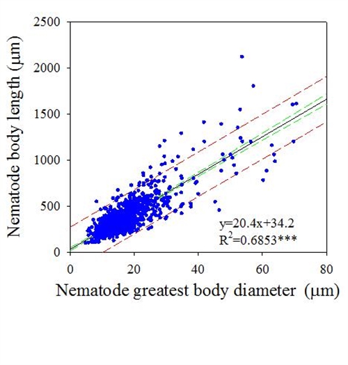 ,其中W为生物量、D为体宽。通过进一步与传统方法的比较发现,新方法可以对土壤总线虫、食真菌线虫、植食性线虫和捕食性线虫生物量进行无偏估计,但是会略高估食细菌线虫生物量和低估杂食性线虫生物量。线虫食性与其食物网营养级关系直接相关,为了进一步提高对不同食性线虫生物量的测算精度,进一步提出了针对各食性线虫的生物量测算公式,可以达到对各食性线虫生物量的无偏估计效果。新方法大大节约了线虫生物量测算的时间,将推动线虫生物量获得更广泛的应用,提高土壤线虫功能以及它们与土壤关键过程和功能关系研究的准确性。